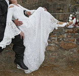 Traumhaftes Kleid für die Mittelalterhochzeit. Rock Ausgestellt, mit und ohne Reifrock zu tragen. Kleine Schleppe. Weite Trompetenärmel. Schultern frei. Schnürung hinten. Wird auf Maß